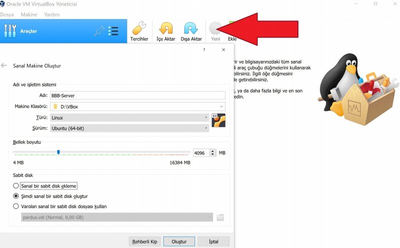 Şimdilik deneme olsun diye sunucumu sanal bilgisayara kuracağım. Oluşturacağım sunucu için Virtual Box programını https://www.virtualbox.org/wiki/Downloads adresinden indirip kurduktan sonra çalıştırdım. Daha sonra gerçekleştirmeyi düşündüğüm 2. senaryoya da hazır olması için 64 Bit Ubuntu üzerine yeni bir makine oluşturalım.