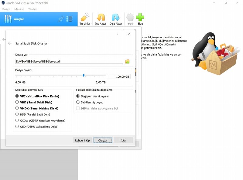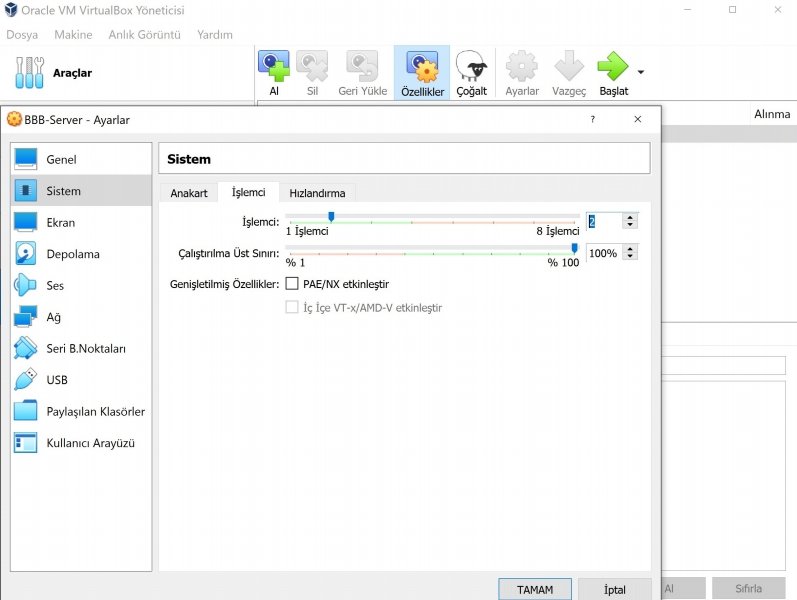 100GB disk alanı vererek oluşturduğum makinenin ayarlarından makineme 2 işlemci çekirdeği ayırdım.