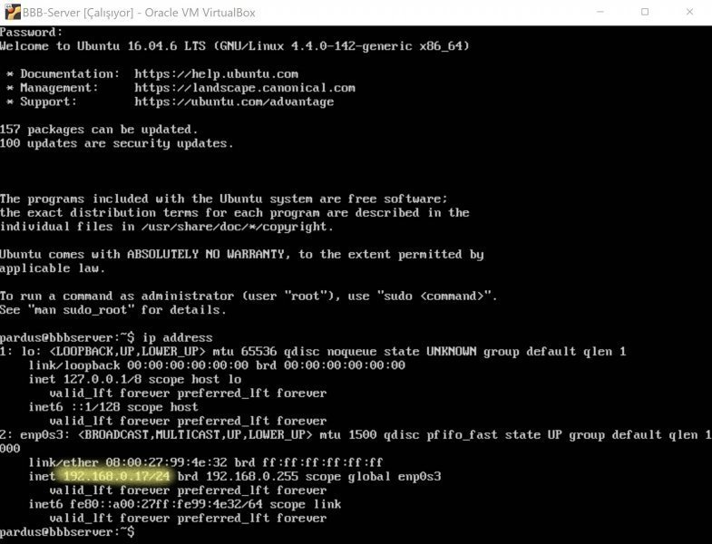Kurmuş olduğunuz server bilgisayara SSH servisinden bağlantı kurmak için Pardus'ta konsolu kullanabiliriz. Diğer işletim sistemi için https://the.earth.li/~sgtatham/putty/latest/w64/putty.exe adresinden indireceğiniz "Putty" programı yeterli olacaktır. Ancak server bilgisayarınıza SSH bağlantısı kurabilmeniz için bir defaya mahsus sanal Ubuntu Sunucunuzu başlatıp giriş yaptıktan sonra "ip address" komutunu çalıştırıp server sunucunuzun aldığı IP adresini öğrenmeniz gerekmektedir. Artık çalıştırmanız gereken komutları bu yazıdan kopyalayıp farenizin sağ tuşu ile konsolunuza veya Putty ekranına yapıştırabilirsiniz.
