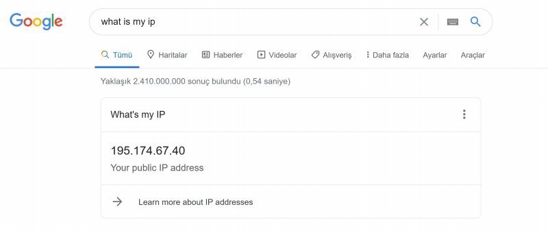 Modemimin arayüzünden veya  veya basit bir web araması ile dış dünyaya açılan ip adresimi öğreniyorum.