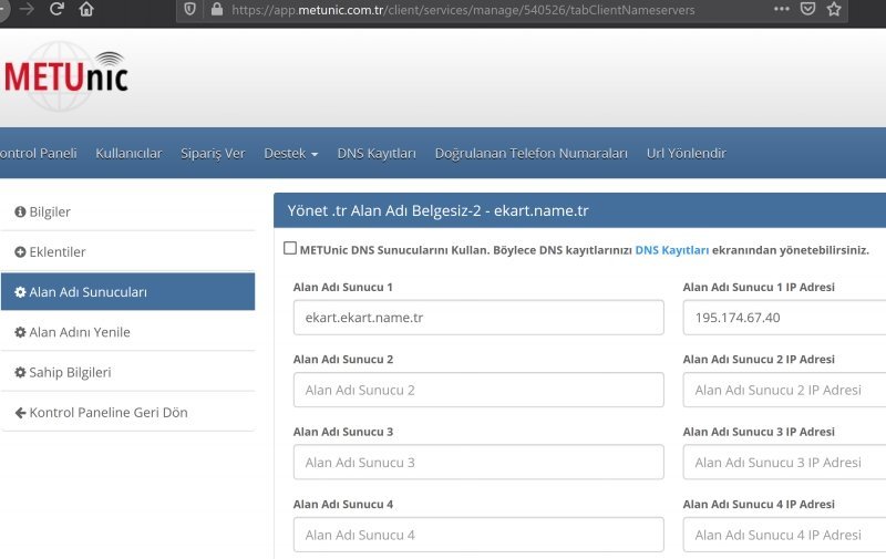 "ekart.name.tr" ismini aldıktan sonra sitenin kontrol panelinden bu ismi evimdeki modemin dış İP adresi ile henüz oluşturmadığım bir dns sunucuya yönlendiriyorum. Alan adı sunucusu 1 bölümüne baş kısmını unutmayacağınız istediğiniz bir ifade yazın. Fotoğrafta "ekart.ekart.name.tr" olarak görünse de daha sonra "ns.ekart.name.tr" olarak değiştirdim.