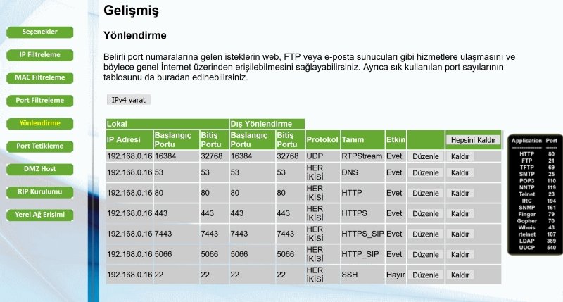 Modem ayarlarına girip gerekli yönlendirme (NAT) ayarlarını yapıp tüm hizmetleri yeniden başlatalim.